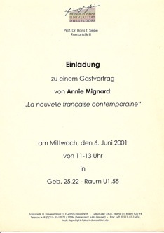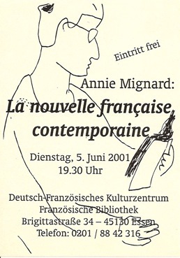 “La Nouvelle Française Contemporaine: Vortrag und Diskussion in französischer Sprache” Centre Culturel allemand-français, Essen, Allemagne, 2001