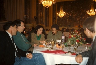Festival de la nouvelle de St Quentin: de gauche à droite les écrivains Jean-Louis Cordebard, Alain Demouzon, Annie Mignard, un invité et de trois-quarts dos Alain Absire